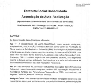 De acordo com os artigos 15, 16, 17 e 18 do Estatuto Social desta Associação, convocamos os seus membros, com frequência regular, a participarem da Assembleia Geral Extraordinária a ser realizada no Centro do Rio de Janeiro da Self-Realization Fellowship, no sábado, dia 6 de dezembro de 2025 às 17h30, após o Serviço de Leitura , para deliberar sobre a seguinte ordem do dia: