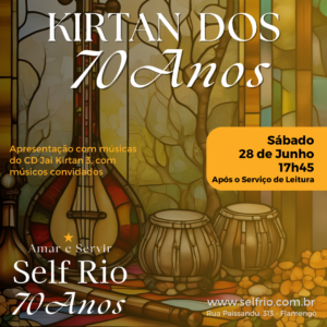No próximo sábado, dia 28 , fechando o período das atividades de comemoração dos 70 Anos da Self Rio, nossos músicos e alguns convidados especiais farão um kirtan especial com bhajans do CD Jai Kirtan 3. Haverá novidades como a presença de instrumentos novos, dentre estes sitar indiano, tambura, violoncelo e violão!!